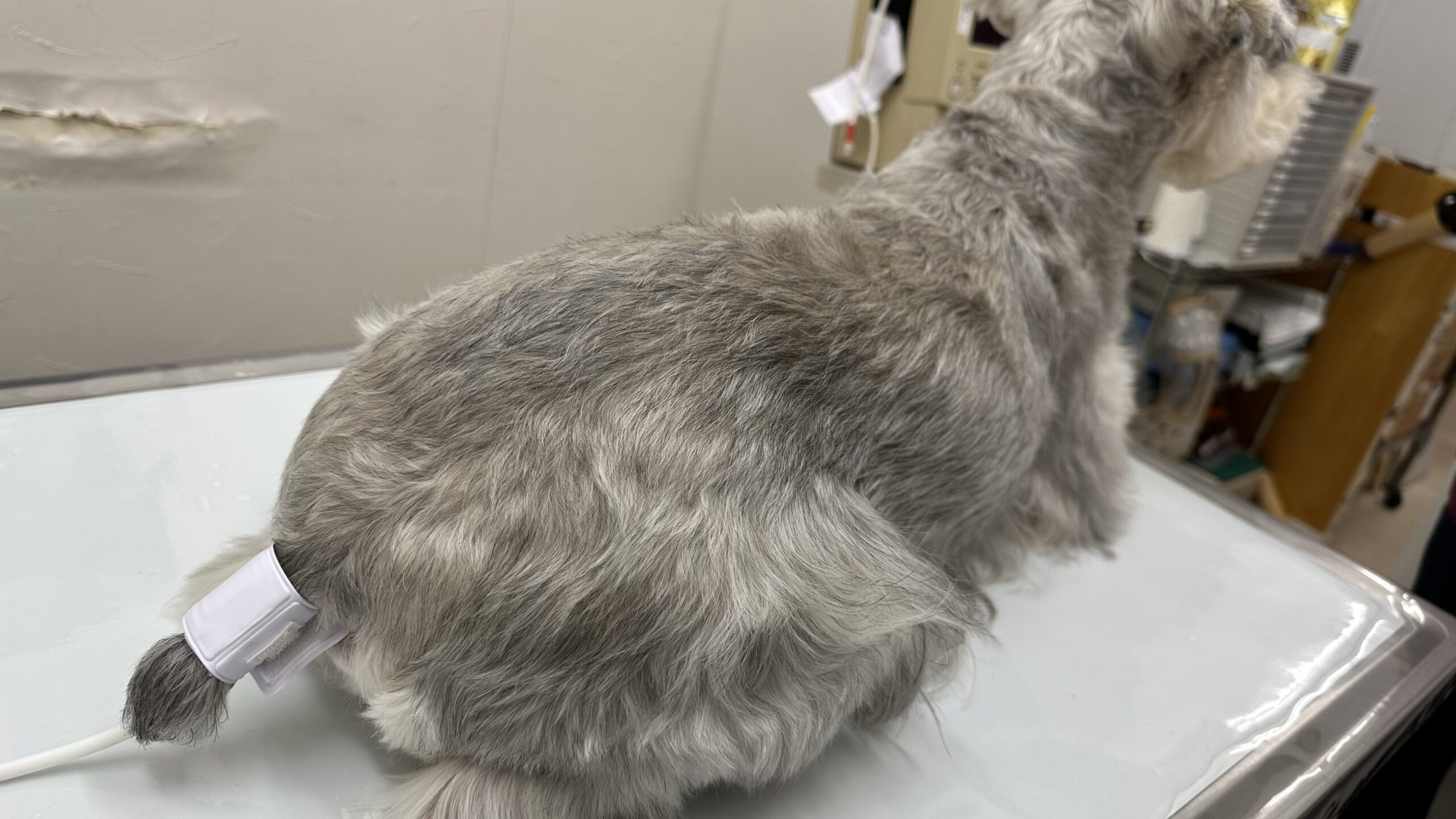 このように伏せの状態で尻尾にカフを巻きます。