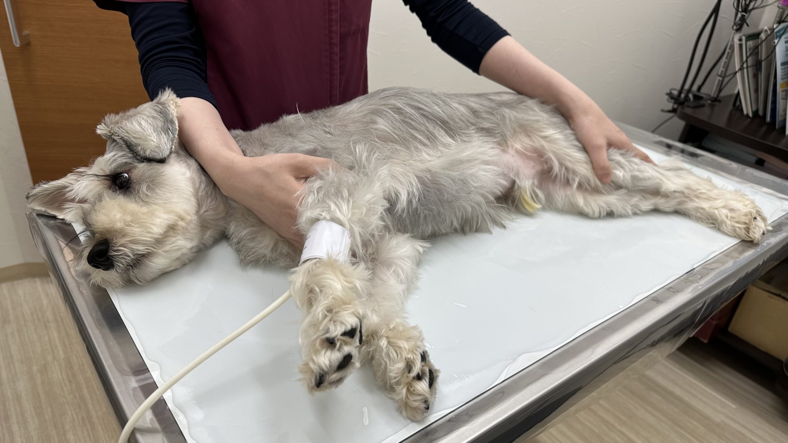 場合によっては横向きにして前肢や後肢にカフを巻き、測定することもあります。